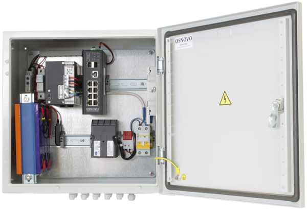 Уличный управляемый (L2+) коммутатор на 10 портов с термостабилизацией, резервным питанием и функцией мониторинга температуры/влажности/напряжения на базе уличной станции OS-44TB1.