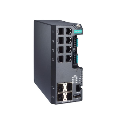 Управляемый коммутатор Gigabit Ethernet с 8 портами 10/100BaseT(X) 802.3bt PoE, 4 слотами 100/1000BaseSFP, двумя входами питания 12/24/48 В пост., 48 В пост. для питания по PoE.