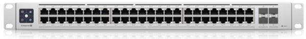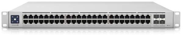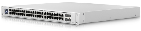 UniFi Enterprise Switch 48 PoE для точек доступа Wi-Fi 6 с портами 2,5 Гбит/с RJ45 Ethernet PoE+ и четырьмя портами 10 Гбит/с SFP+ для подключения к магистральным линиям.