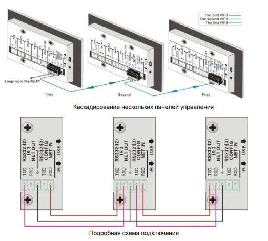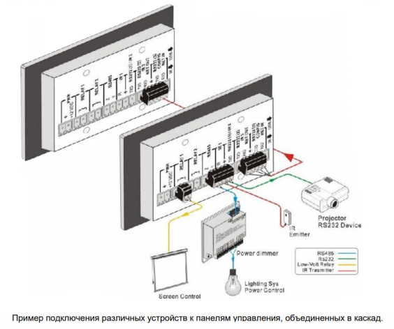 99 программируемых управляемых панелей могут быть соединены в каскад с единым управлением, при этом каждая будет иметь свой идентификатор (ID). С любой панели в каскаде можно управлять любым устройством, подключенным к ним