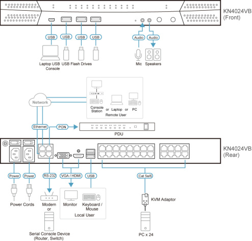 KVM-переключатель KN4024VB позволяет пользователям подключаться к центрам обработки данных с локальной консоли и удалённо по IP для отслеживания состояния. Устройства серии KN оснащены функцией удвоенной скорости передачи данных, встроенным криптографическим модулем и двумя сетевыми картами. Доступ возможен через WinClient/JavaClient* и приложение для iOS — PadClient. Внешний модем обеспечивает внеполосный доступ для устранения неполадок на уровне BIOS.