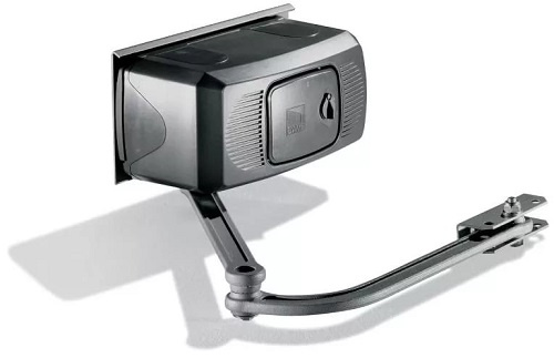 Редуктор рычажного типа представляет собой универсальное решение для распашных ворот, которые монтируются на широких колоннах, поскольку установка линейных приводов в таких местах непрактична или невозможна. Предлагаемая конструкция рассчитана на установку на створки шириной до 4 метров и массой до 800 кг. Комплект автоматики для распашных ворот включает один редуктор и блок управления. Плата управления данной модификации находится в отдельном корпусе, к которому подводится напряжение 220 В, при этом, для сокращения длины электропроводки желательно располагать его рядом с воротами.