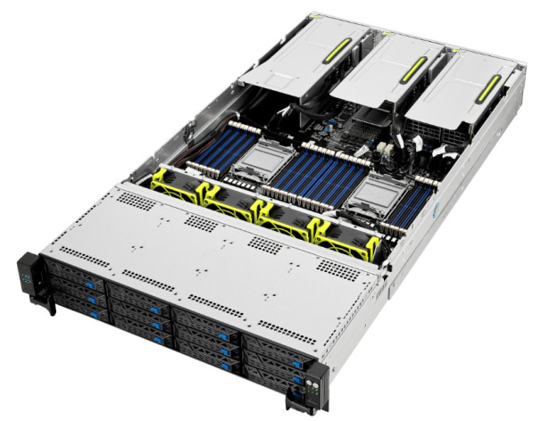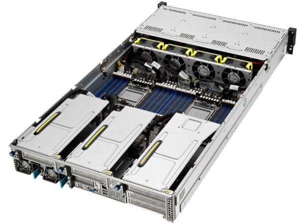 Двухпроцессорный сервер высотой 2U на базе масштабируемых процессоров Intel Xeon 3-го поколения, поддерживающий до 32 модулей DIMM, четыре двухслотовых графических процессора, восемь NVMe, девять слотов PCIe 4.0, OCP 3.0, двойной M.2 и ASUS ASMB10-iKVM.