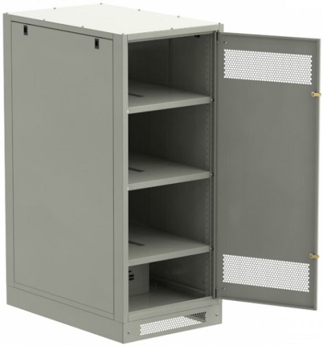 Шкаф аккумуляторный серии LINEA B предназначен для размещения и защиты от несанкционированного доступа аккумуляторных батарей (АБ). Шкафы LINEA B повышенной прочности со сварным каркасом и усиленными полками позволяют размещать АБ до 500 кг. на полке. Вместе со шкафом поставляются полки. Количество полок в комплекте зависит от высоты шкафа. Каркас позволяет размещать полки с шагом 30мм. В полках предусмотрены вырезы для удобства соединения АБ. В нижней части корпуса предусмотрена плата для установки предохранителя-выключателя-разъединителя ПВР. Шкаф аккумуляторный серии LINEA B односекционный поставляется на цоколе высотой 100мм. Все металлические части шкафа LINEA B заземлены. В комплект включены РЫМ-болты для удобства перемещения шкафа.