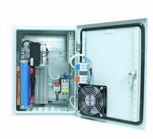 Уличная станция с термостабилизацией, резервным питанием и оптическим кроссом. Промышленный БП DC48V(240W), АКБ 48В(2Ач). Защита АКБ от глубокого разряда. В основе металлический шкаф с классом защиты IP66. Доступное место под установку оборудования на встроенные DIN-рейки: верхняя — 80мм.
