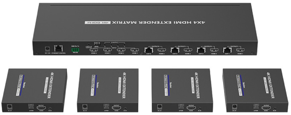 Lenkeng LKV844 — матричный переключатель видеосигнала размерностью 4?4 с разрешением до 4096?2160. Устройство переключает входы видеосигнала на произвольные выбранные выходы для коммутации в сложных системах. Матрицы не вносят дополнительной задержки, кодирования или любого другого ухудшения сигнала. Базовое разрешение составляет 4K 3840?2160 при 60 кадрах в секунду на 70 м по кабелю cat.6. Максимальное число передатчиков — 4, подключённых устройств — 4. Питание по кабелю с одной стороны, Power over Cable (PoC). Поддерживается передача ИК-сигнала пульта от дисплея к источнику для управления рекордером или медиаплеером. Локальный выход HDMI на передатчике для мониторинга сигнала или использования в качестве делителя (сплиттера). Цифровой аудио выход S/PDIF. Последовательный порт RS232 для удаленного управления. Удаленное управление с компьютера по локальной сети.